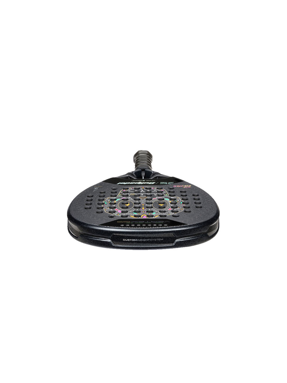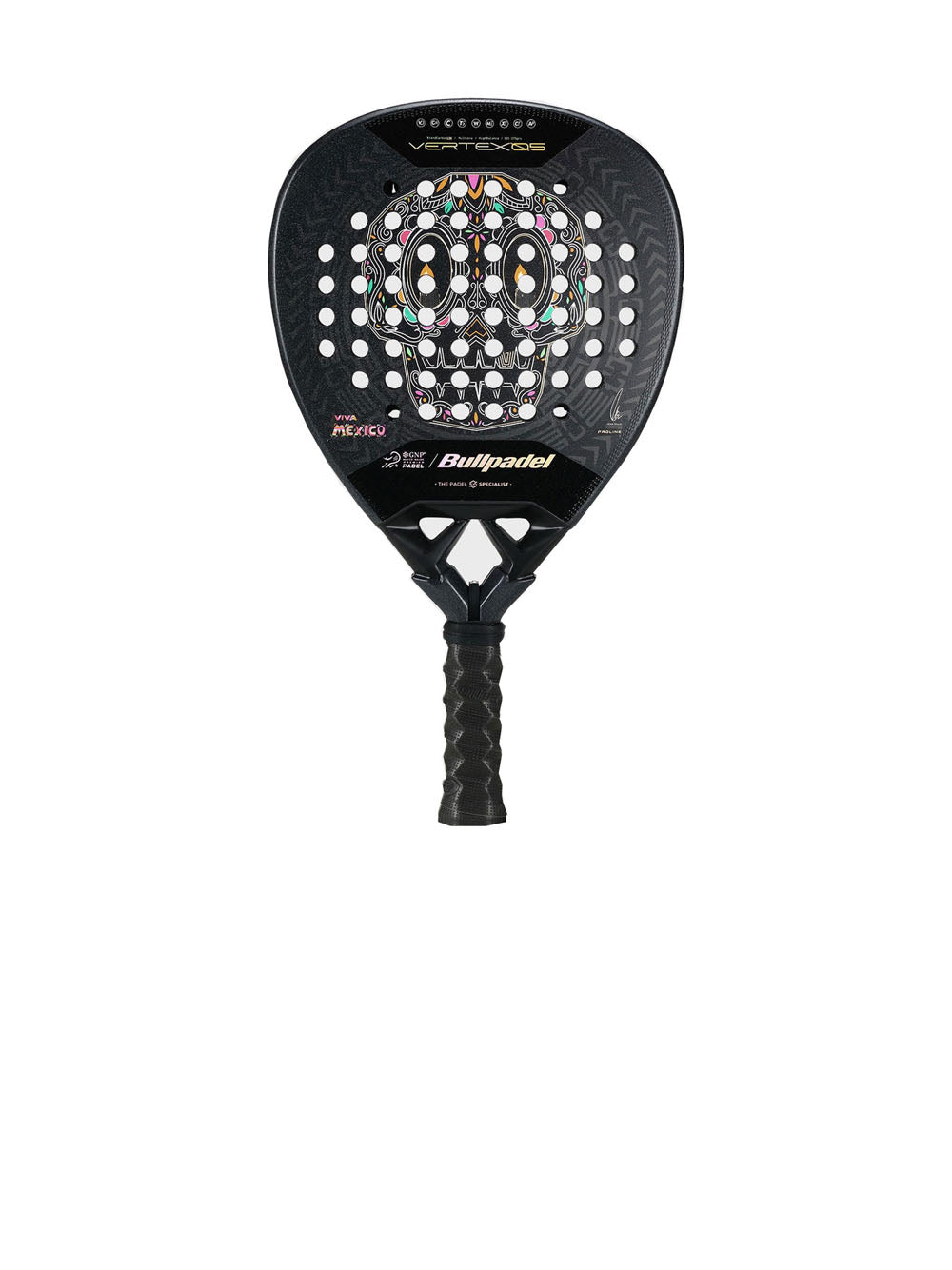 La superficie è definita da una base in tonalità scure che esalta i motivi geometrici e floreali ispirati all'architettura e all'arte tradizionale del Messico. Questo design crea un contrasto elegante con i dettagli in rosso e oro che irradiano energia e potenza in campo. La composizione riflette il carattere competitivo e tecnico di questa racchetta, pensata per giocatori che cercano la massima performance con un'identità visiva unica. Come sigillo finale della collezione, incorpora la firma di Juan Tello e la scritta “VIVA MÉXICO”, simboli dell'orgoglio nazionale e dello stretto legame tra Bullpadel e la comunità messicana del padel.