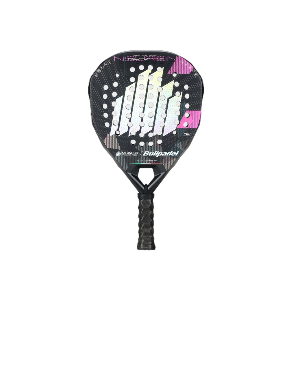 La Neuron 02 Edge Milano si distingue per il suo design all’avanguardia e urbano , con una palette di colori che combina bianco, nero e tocchi di rosa fucsia. La sua estetica gioca con geometrie e contrasti, creando una racchetta moderna e accattivante che riflette l’energia di una città cosmopolita come Milano. Da un lato, la “B” distintiva di Bullpadel domina la silhouette, mentre dall’altro, un motivo ispirato alle forme del Duomo di Milano è al centro della scena, un cenno architettonico che fornisce una finitura sofisticata e di carattere.